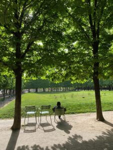 Jeudi, toujours ce grand ciel clair au-dessus des toits de Paris et ce beau soleil qui viendra effacer la fraîcheur du matin. Rendez-vous avec les filles au Jeu de Paume pour découvrir le travail du photographe britannique Martin Parr décédé en décembre de l’année dernière. En avance, j’en profite pour marcher entre les allées du jardin des Tuileries, plus ancien et plus vaste jardin de Paris. Je me rappelle combien le trio était heureux de se promener à dos d’âne, de rêver dans le manège ou de sauter sur la toile des trampolines. A cette heure, les chaises sont vides mais leur disposition raconte ce qu’elles ont vécu la veille: deux chaises se font face, d’autres sont installées côte à côte, certaines forment une ronde. A l’ombre des ormes, je m’arrête pour regarder une corneille. Elle se tient debout sur le bord métallique d’une poubelle. Avec adresse, elle défait le noeud qui ferme le sac quand elle aurait pu le trouer. Elle en sort un papier blanc tout chiffonné ayant contenu des viennoiseries. Elle le pose sur le sol, le déplie et en fait tomber des miettes. Ces oiseaux sont parmi les plus intelligents.