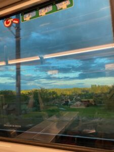 Nous reprenons le métro. Les filles continuent sur la ligne 7. Julia et moi avons un changement à Châtelet. A Montmartre, les terrasses sont prises d’assaut. J’embrasse ma soeur qui s’en va chercher sa petite fille à l’école et je repars en sens inverse tirant ma petite valise rouge. Une heure plus loin, Victoire et moi sommes assises à côté l’une de l’autre dans le sens de la marche à bord d’un Intercité. En face de nous, un jeune homme a posé sur la tablette son ordinateur portable et un roman Si je dois te trahir de l’autrice roumaine Ruta Sepetys.