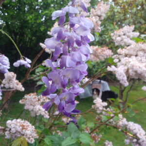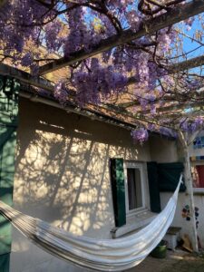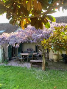 A notre retour du Maroc, la nature avait pris de l’avance sur le calendrier printanier. Je suivais avec un mélange de joie et d’émotion l’évolution des grappes de notre glycine. J’étais si heureuse à l’idée de la voir s’ouvrir complètement et former un grand ciel mauve au-dessus de la terrasse. Je songeais que la glycine mettait toujours un point d’honneur à être au rendez-vous de l’anniversaire de notre fille cadette. Des points bleus apparaissaient dans les grappes les plus proches de la maison et, en deux nuits, le gel, normal en cette saison, a eu raison des trois quart des bourgeons. C’est le coeur lourd que je les ai vus s’affaisser avant de tomber. Je me console à la vue des grappes qui ont survécu au froid dont je respire tous les jours le délicieux parfum.