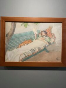 C’est difficilement que nous réussissons à trouver au cinquième étage la toute petite salle qui abrite une exposition intitulée Lumière du Nord. En tout, douze oeuvres réalisées par des peintres scandinaves et néerlandais. Nous sommes unanimes pour saluer le travail de Carl Larsson qui a représenté une jeune femme lisant étendue sur un banc en bois avec un chien sur les jambes et un chat sur la poitrine. On perçoit un profond sentiment de sérénité chez ces trois sujets, un bien-être entier qui est communiqué à celui qui prend le temps de contempler la scène.