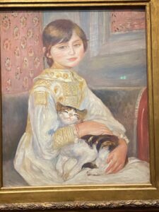 Je reste un long moment devant une toile intitulée Enfant au chat. Elle représente Julie, la fille de Berthe Morisot et d’Eugène Manet, frère d’Edouard. Elle a été peinte en 1887. Julie tient son chat sur ses genoux. Le chat semble si heureux qu’on pourrait l’entendre ronronner. La petite fille a un regard clair très doux. Elle sourit légèrement à celui qui l’immortalise dans sa neuvième année. Les filles n’ont pas été très sensibles à l’oeuvre de Renoir et ont traversé les salles au pas de charge.
