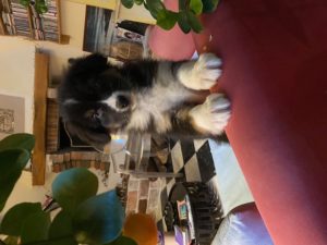 Nous n’avons pas eu envie d’acheter une « cage » souvent utilisée par les éleveurs. La cage est, à la fois, le lieu dans lequel l’animal dort se sentant dans son espace à lui, en sécurité et le moyen quand on s’en va de s’assurer qu’il ne passera pas son ennui et sa solitude sur le mobilier de la maison. La cage ne doit pas être vécue comme une prison pour le chiot. Il faut plusieurs jours (sauf si l’éleveur en avait une) pour que l’animal l’apprivoise et puisse s’y sentir bien. Puisque nous n’avons pas opté pour la « cage », nous avons sécurisé l’intérieur de la grande pièce dans laquelle vit Alto. Un carton barre l’accès à l’escalier. Une corbeille pour le linge d’un bel orange est coincée entre le canapé rouge et le vaisselier jaune. Une valise rouge ferme le passage entre l’autre partie du canapé et le petit meuble sur lequel reposent le grille-pain, la machine à café et le micro-ondes. Ainsi, Alto ne risque-t-il pas de mordiller un câble ou de se blesser en attaquant le bois d’une bûche ou en tombant dans les marches de l’escalier.