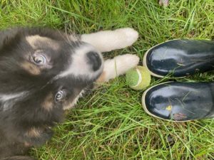 Tandis que je suis en passe d’achever ma marche, Stéphane m’appelle pour savoir où je suis. Je m’étonne que Louis et lui aient déjà fini de jouer au tennis. La pluie se met à tomber alors que j’ouvre la porte en bois du portillon. Je retire mes chaussures, enfile mes sabots d’un joli rose pailleté et suis Louis qui me demande de m’installer dans le canapé et de fermer les yeux. J’obtempère. Stéphane dépose quelque chose sur mes genoux: un chiot berger australien. Il répond au prénom d’Alto. Il a deux mois et demi. Je regarde ce tout petit animal qui ressemble à un ourson et suis assaillie par un flot d’émotions contradictoires. Je ne m’y attendais vraiment pas. Nous avons pour projet de quitter la campagne pour la ville. La mort de notre Fantôme survenue voici presque trois ans m’a dévastée. Je ne sais pas si je suis encore prête à renouer de tels liens avec un autre chien. Je me demande si, une partie de moi ne s’est pas fermée à l’idée d’accueillir un jour un autre compagnon quatre pattes. D’ailleurs, j’ai souvent dit et écrit que Fantôme serait notre unique chien.