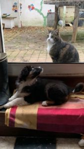 Stéphane lui avait acheté des os pour qu’il soulage ses gencives mises à mal par les poussées dentaires. Un os a disparu dans le jardin. Quant à l’autre, Alto l’avait enterré profondément dans le pot contenant un petit oranger. Toute la pièce sentait l’humus. On se serait cru dans la forêt en automne. Alto aime gratter la terre et s’y nicher, se jeter la tête la première dans les tapis de feuilles mortes et suivre le chat dans ses déplacements. C’est amusant de voir Cookie et Alto ensemble. Alto aimerait jouer avec le chat mais ce dernier est encore un peu sur la réserve. Alto commence à comprendre que pour ne pas effrayer Cookie, il doit éviter de se précipiter sur lui.