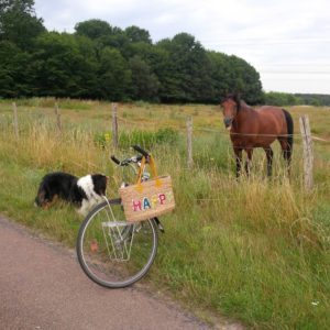 Le matin alors que je buvais mon café, il aimait poser son menton sur le bord de la table, toujours à ma gauche, et nous écoutions ensemble les nouvelles du monde. Nous lui avions appris à nous suivre en vélo et à s’assoir au bord de la route quand il entendait une voiture approcher. Quand un patient attendait derrière la porte, il m’avertissait par un seul aboiement. Il savait que le couloir desservant les chambres ou l’escalier menant à la mezzanine lui étaient interdits et il respectait parfaitement ces espaces. Il n’aimait pas l’eau et dés que Céleste l’avait lavé, il se roulait comme un beau diable dans l’herbe chauffée par le soleil ou dans la terre. Il attrapait du bout des dents les mûres sur les mûriers. Il voyageait admirablement bien dans le coffre du Volvo et ne se plaignait pas quand une valise tombait sur lui.